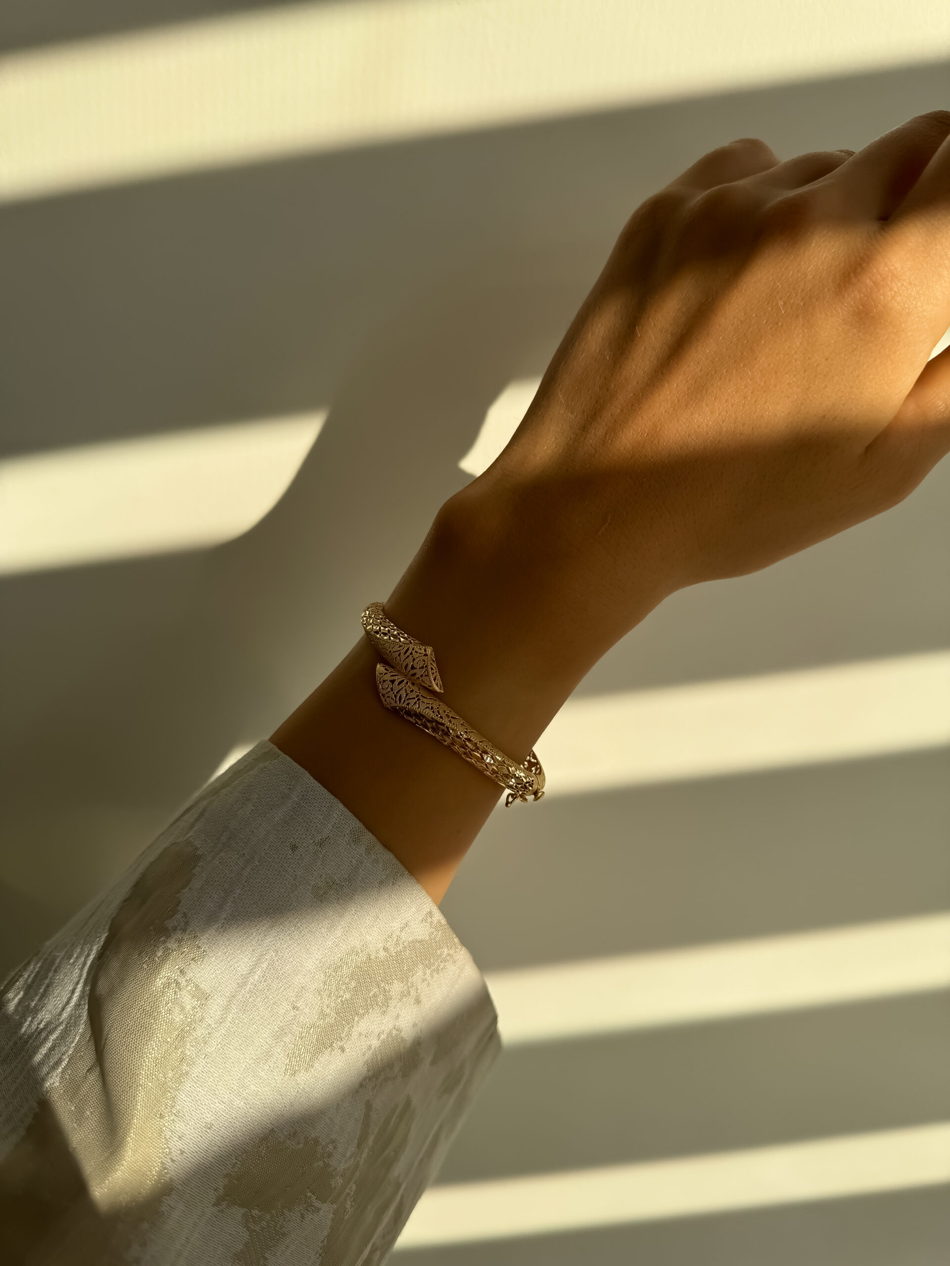بنگل ونوس، نماد زیبایی و ظرافت است که با طراحی بینظیر و جذاب خود، هر دست را به شکلی خاص و منحصر به فرد زیبا میکند. این بنگل با استفاده از طلای خالص ۱۸ عیار و با دقت و ظرافت فراوان ساخته شده است، تا شما را در هر مناسبتی همیشه درخشان و متمایز نشان دهد.